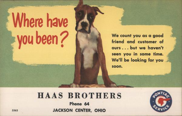 Where have you been? We count you as a good friend and customer of ours... but we haven't seen you in some time. We'll be looking for you Soon. HAAS BR OTHERS PONTIAC Phone 64 SERVICE JACKSON CENTER, OHIO 5563