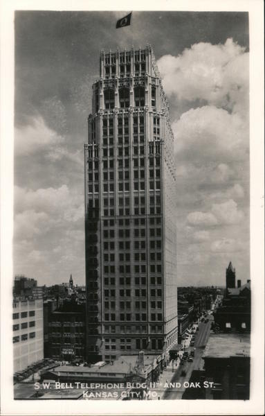 Front: alA IWA STATIONERS PMEYER HOWY OFFICE PARWTING 31 COOK'S AUTO RAR ENT CARAGE TORAGE FERR MCORE S.W. BELL TELEPHONE BLDG HH AND OAK ST. KANSAS CITY, MO, Back: 5-#7800 wa THIS IS A GENUINE GROGAN PHOTOGRAPH