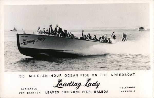 Front of card shows a group of people waving from a speeding boat, the "Leading Lady". Front of card also reads "55 mile-an-hour ocean ride on the speedbost Leading Lady. Leaves Fun Zone Pier, Balboa. Available for charter. Telephone Harbor 6" |