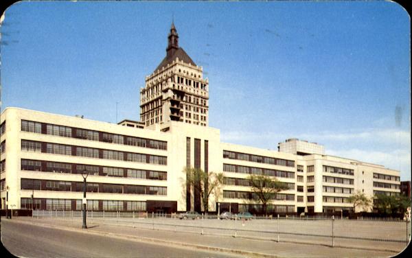 Camera works fills two city blocks near downtown Rochester, New York. Here, the Eastman Kodak Company manufactures cameras and photographic apparatus. The company's 19 Story office building towers in the back ground.