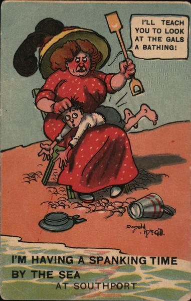 Front: I'LL TEACH YOU TO LOOK AT THE GALS A BATHING! Dogald I'M HAVING A SPANKING TIME BY THE SEA AT SOUTHPORT Back: THIS SPACE MAY BE USED FOR COMMUNICATION. No. A 43