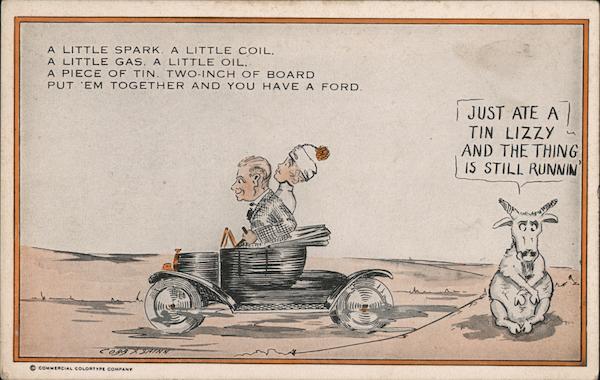 Front: A LITTLE SPARK. A LITTLE COIL. A LITTLE GAS. A LITTLE OIL, A PIECE OF TIN. TWO-INCH OF B OARD PUT 'EM TOGETHER AND YOU HAVE A FORD. JUST ATE A TIN LIZZY AND THE THING IS STILL RUNNIN COMMERCIAL COLORTYPE COMPANY Back: TPF Poster al rd