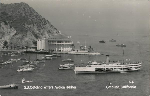 Front: ESTALINS 106 S.S.Catalina enters Avalon Harbor Catalina, California Back: PHOTO POST CARD; --Kodak-- |- Paper -- In totalere 10/17/3 ANGELENO PHOTO SERVICE- 1030 SO. ALVARADO, L. A. 6, CALIF. - 2 L6