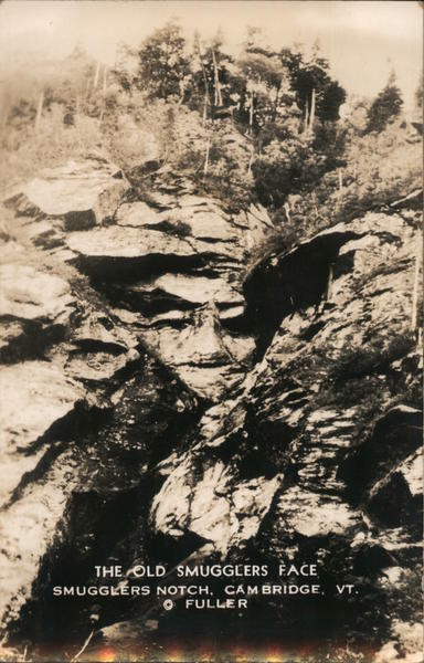 Front: THE OLD SMUGGLERS FAĆE SMUGGLERS NOTCH, CẢM BRIDGE, VT. FULLER Back: CLAYTON FULLER, MONTGOMERY, VT. DEFENDER DEFENDER