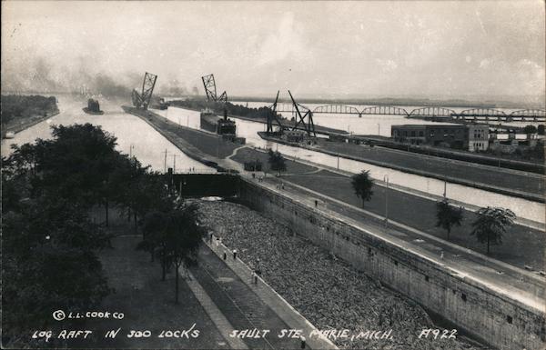 Front: O L.L. COOK Co LOG RAFT IN JOO LOCK'S SAULT STE MERIE, MICH, Back: JW VIS ALL RIGHTS RESERVED THE LL COOK CO. MILWAUKEE 1798