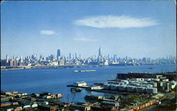 Looking beyond the commercial docks of New Jersey, the famous New York Skyline rises above the Hudson.