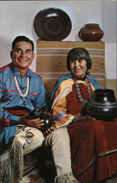 Front: ごに y 0 ** Back: MARIA and POPOVI-DA-POTTERS of San Ildefonso Pueblo New Mexico K-13153 COLOR PHOTOGRAPHY BY MAURICE EBY AMERICAN INDIAN SERIES - C. SCHLOSSER, BOX 813, TAOS, N. M. • BY TICHNOR BROS., BOSTON, MASS.