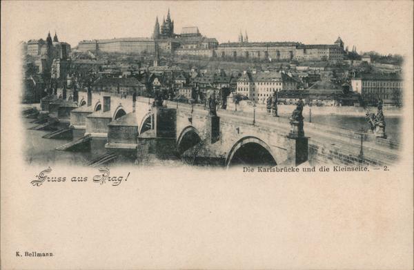 Front: Die Karlsbrücke und die Kleinseite. – 2. Geuss rruss anus K. Bellmann. Back: Correspondenz- Karte.