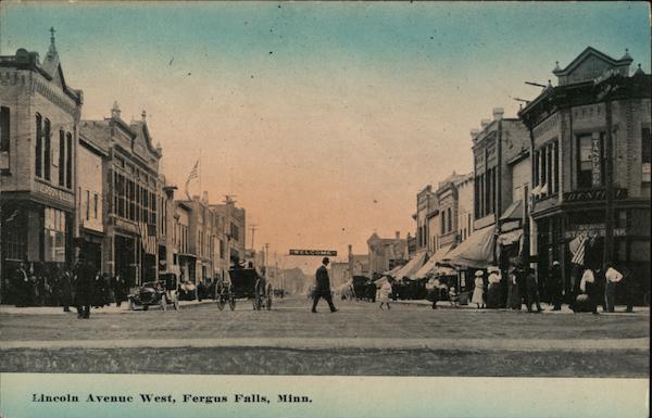 Front: NEXSENTES **** CWELCOME Lincoln Avenue West, Fergus Falls, Minn. AD 6102 TAZOJROD SCANO STATE, E NK. Back: 1800 STAMP