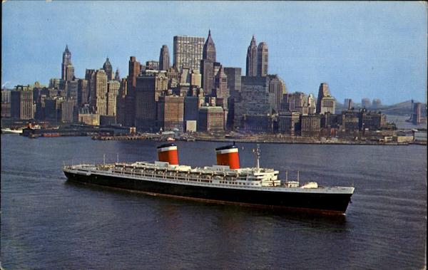 This colorful airview shows the super liner United States in upper New York Bay with part of the city's famed downtown skyline in the background