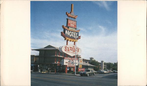 Front: LOTUS MOTOR TT Sambo's RESTAURAIT COCKTAIL LOUN TRT PPG WTLE IPS SRG IEPS SAPRAS BEAUTY SARY WELCOME PROPER ENTRANCE Back: HYATT LODGES LOTUS INN HYATT LODGE 1213 Las Vegas Boulevard South Las Vegas, Nevada 89104 To STAMP