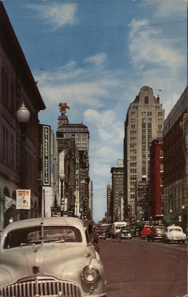 Front: Clears Ad SETATEAoz uumANING PADGIT FINE LE 70 Back: TC-168 STREET SCENE Street scene, looking east, Dallas, Texas. PUB. BY TEXACOLOR CARD CO. 1951 Color by: R. J. Ord MIRRO-KROME CARD BY H. S. CROCKER CO., INC., SAN FRANCISCO 1, CALIF. here