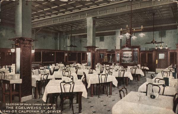 Front: SECTION OF MAIN DINING ROOM IN THE EDELWEISS CAFE 1649-55 CALIFORNIA ST., DENVER. LAY (1 Back: THE SMITH-BROOKS PRESS, DENVER POST ARD Deu ید Colo. DOMESTIC; FOREIGN: ind احد اشتیم که familiar ат вал Mande,