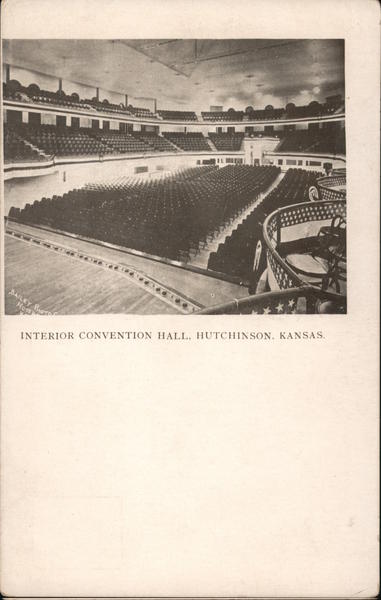 Front: BAILEY PHOTO HUTC INTERIOR CONVENTION HALL, HUTCHINSON, KANSAS. Back: The Mirror Print Shop. Post Card Printers, Hutchinson, Kansas 44- Here