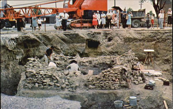 | Exact location of an old army Fort building in 1808 - 1809 was not discovered until June 1965. Construction work in parking lot of Sheaffer Pen Co., revealed the foundation of the central blockhouse. Students from Iowa University archaeology department at shown, reconstructing the ruins. |
