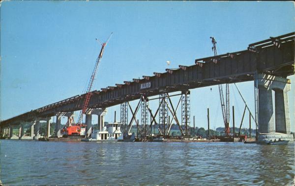 Route 80 bridge at Éclair, Iowa connecting the East and West on the Mississippi River. Scene shown the "key" center span being floated in and set in place during the summer of 1966.