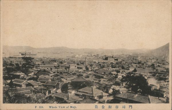 Front: F. 358. Whole View of Moji. 景全街市司門 Back: Cartolina postale - Dopisnice - Levelezo-Lap Karta korespondencyjna - Briefkaart Correspondenzkarte Tarjeta postal Brefkort Brevkort Открытое письмо MADE IN JAPAN 40