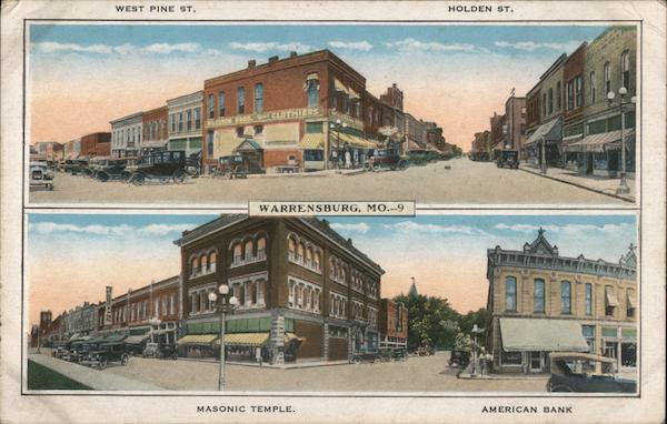 Front: WEST PINE ST. 11 WILCOTON BROS. CLOTHIERS WARRENSBURG, MO.--9 FED MASONIC TEMPLE. 300 HOLDEN ST. 18 AMERICAN BANK ICC Back: E. C. KROPP CO., MILWAUKEE 18345-N 3° TO ANYWHERE IN U S. VIA AIRMAIL Co
