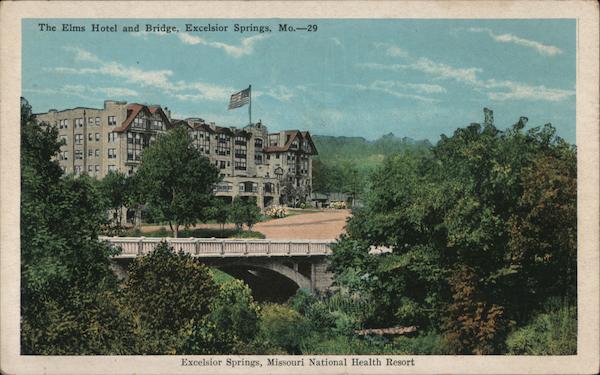 Front: The Elms Hotel and Bridge, Excelsior Springs, Mo.-29 CC CEE C FEE IT IC EFF REF HA 20 ***** Excelsior Springs, Missouri National Health Resort Back: E. C. KROPP CO., MILWAUKEE 27118 HERE