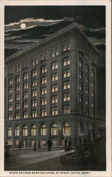 Front: SATEE **** 20470 10 STATE SAVINGS BANK BUILDING, BY NIGHT, BUTTE, MONT. Back: MADE IN U S. A. PUBLISHED BY KEEFE BROS:, POST OFFICE NEWS STORE, BUTTE, MONT, C. T. AM RICAN R-37195 THIS SPACE FOR ADDRESS ONLY.