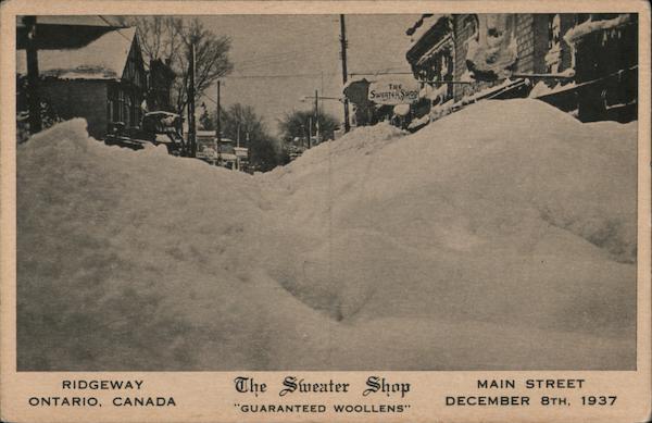 Front: RIDGEWAY CONTARIO, CANADA SWEATER SHOP The Sweater Shop "GUARANTEED WOOLLENS" MAIN STREET DECEMBER 8TH, 1937 Back: P.S. This is such an interesting shop, you'd surely enjoy visiting here. HERE