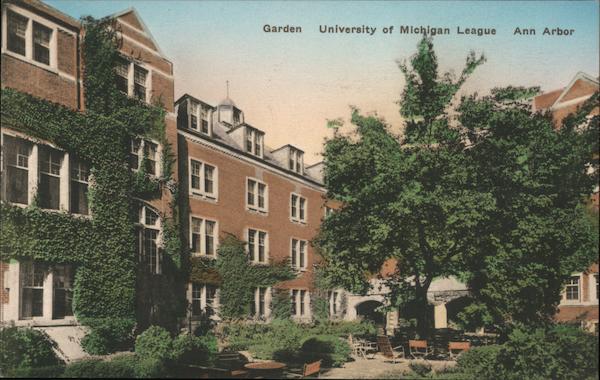 Front: 13 Garden University of Michigan League Ann Arbor LIO W Back: PUBLISHED BY GEO. WAHR, UNIVERSITY PUBLISHER, ANN ARBOR, MICH. -Post Cards of Quality-The Albertype Co., Brooklyn, N. Y.- HAND-COLORED