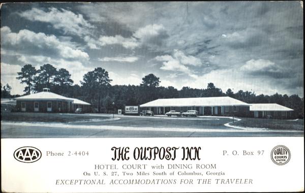 | 30 rooms - all with private baths - air conditioned and centrally heated. Spacious cypress paneled rooms. Playground for children. Telephone in each room. Simmons innerspring mattresses. 2 miles south of Columbus, Georgia on Routes U. S. 27 and U. S. 280 at entrance to Fort Benning. |