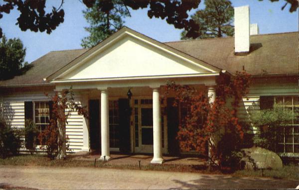 THE LITTLE WHITE HOUSE WARM SPRINGS, GEORGIA View of the Little White House; rear en- trance, showing detail of portico and Paul Scarlet rose bushes in bloom. 2C-K118 - "CURTEICH COLOR" REPRODUCTION FROM KODACHROME OR EKTACHROME ORIGINAL-