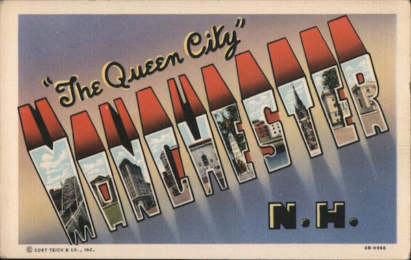 Front: "The Queen City" TC CURT TEICH & CO., INC. BE Tenumer IGPONDAN N.H. 4B-H966 Back: E. J. HOGG, NEWSDEALER, MANCHESTER, N. H. GENUINE CURTEICH-CHICAGO "C.T. ART-COLORTONE" POST CARD (REG. U.S. PAT. OFF.) PLACE