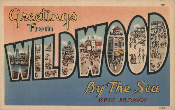 Front: Greetings VISA 115 DWOOD By The Sea NEW JERSEY 61165 Back: PUB. BY LYNN BOYER, JR.. WILDWOOD, N. J. TICHNOR QUALITY VIEWS" REG. U.S. PAT, OFF. MADE ONLY BY TICHNOR BROS., INC., BOSTON, MASS. MADE IN U. S. A