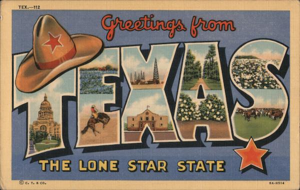 Front: TEX.-112 Greetings from THE LONE STAR STATE C. T. & CO. 8A-H514 Back: DALLAS POST CARD CO., DALLAS, TEXAS GENUINE CURTEICH-CHICAGO "C.T. ART-COLORTONE' POST CARD (REG.U.S. PAT. OFF.) PLACE