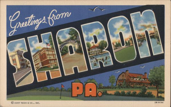 Front: Greetings from IEBIE CURT TEICH & CO., INC. DO PA A. FM 20 2B-H194 Back: SHARON NEWS AGENCY, SHARON, PA. GENUINE CURTEICH-CHICAGO "C.T. ART-COLORTONE" POST CARD (REG. U.S. PAT. OFF.) PLACE