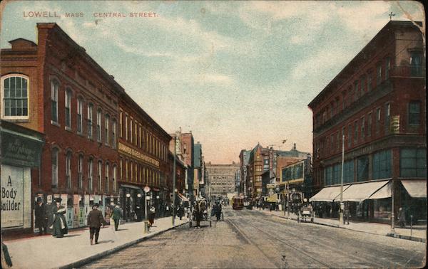 Front: LOWELL, MASS No Morphine Body Builder Ir CENTRAL STREET. DIAMONDS ENGEDHMOOD CT MATCHES EZBruri Back: Mason Bros. & Co., Boston, Mass: No. E. 189 Printed in Germany Post Card.
