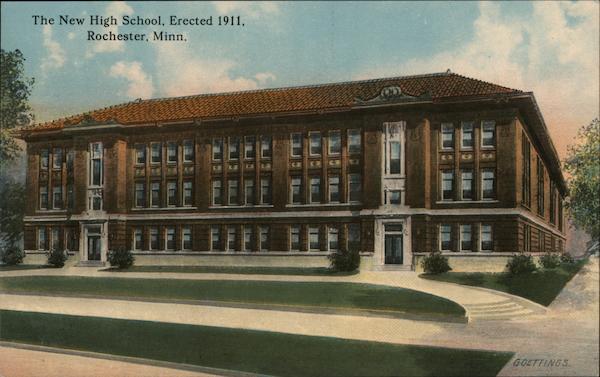 Front: The New High School, Erected 1911, Rochester, Minn. 1024 (3 GOETTINGS. Back: MESSAGE MAY BE WRITTEN ON THIS SIDE. A-16056 For United States; and Island Possessions! Cuba, Canada and For Foreign.