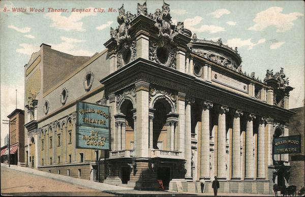 Front: 8-Willis Wood Theater, Kansas City, Mo. HEATRE TONY OF SWORD STOVI BOCOAL CUCK! 10 WILLIS-WOOD WILLIS WOOD THEATRE Back: PUB. BY THE ELITE POST CARD CO. KANSAS CITY, MO. AND LEIPZIG. POST CARD. 3- 2.2