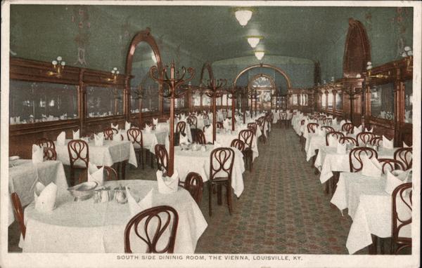 Front: 10 19 SOUTH SIDE DININIG ROOM, THE VIENNA, LOUISVILLE, KY. c Back: MADE ONLY BY DETROIT PUBLISHING CO. "PHOSTINT" CARD. TRADE MARK REG. U. S. PAT. OFF. THIS SPACE MAY BE USED FOR MESSAGE. AND CANADA. FOREIGN. TWO CENTS