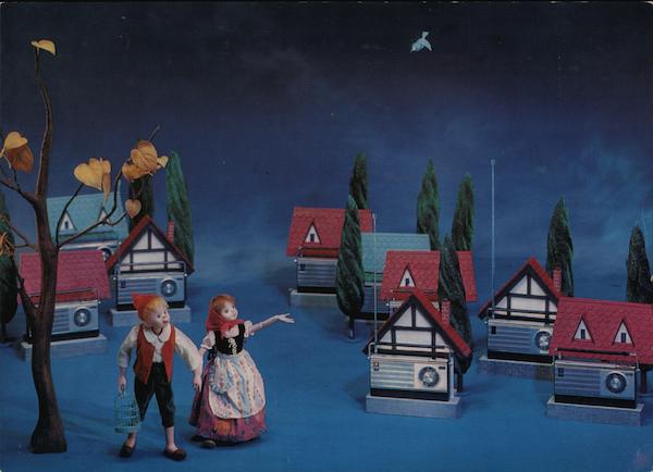 Hansel and Gretel stroll through a wonderland of houses made from Hitachi transistor radios. HITACHI JAPAN. ΤΟ ΚΥ 0, LT HITACHI here