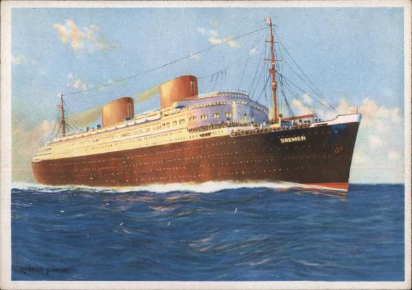 Front: TERESSE33 64 ROBERT SCHMIDT ***** ** ZAT *** FR *** P*SCI BREMEN S Back: NORDDEUTSCHER LLOYD BREMEN VIERSCHRAUBEN-TURBINEN-SCHNELLDAMPFER ,,BREMEN" WILHM. JÖNTZEN, BREMEN Diese Karte wird unentgeltlich abgegeben