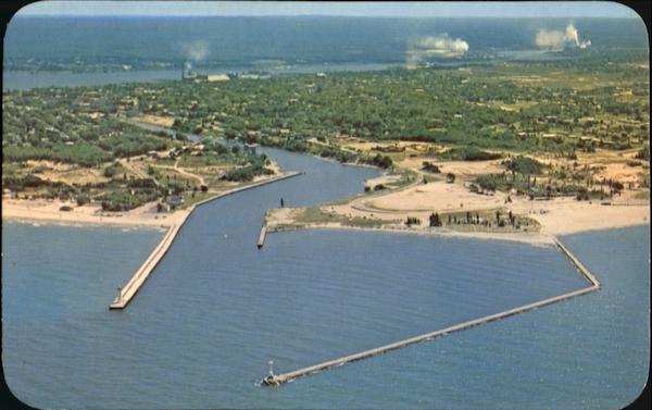 View of the harbor and channel from Lake Michigan. Manistee is famous for its excellent fishing as well as other sports and recreational activities the year around