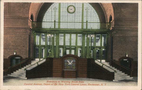 Front: NORTHER PV Entrance to Waiting Room from Central Avenue, Depot of The New York Central Lines, Rochester, N. Y. BARBER Back: CO. SMAN 36828-PUBLISHED from Ma TOCHROME Post Gard Bennie TWO CENTS