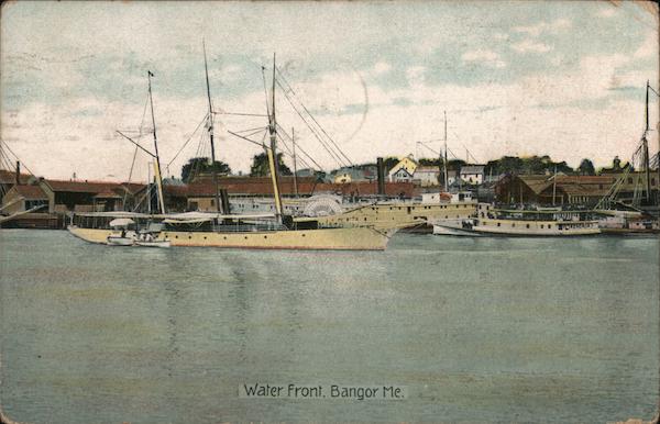 Front: DUT Water Front, Bangor Me. Back: men 7-P Mhis side for the address FEB 17 = 1908 ME GA Gark Bear Cansas. ham Thanks for putty. Slard come Galla Proctos. 18 Firement. St. Gardines. come again woon. 227 raimo