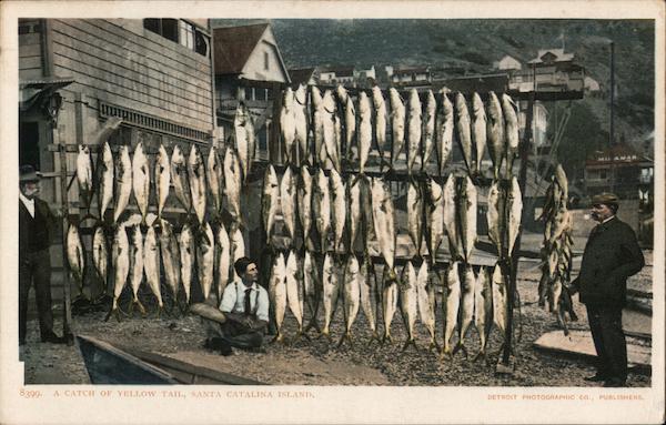 Front: 8399. A CATCH OF YELLOW TAIL, SANTA CATALINA ISLAND. DETROIT PHOTOGRAPHIC CO., AMAR PUBLISHERS. Back: 5- AND CANADA, FOREIGN, Two CENTS.
