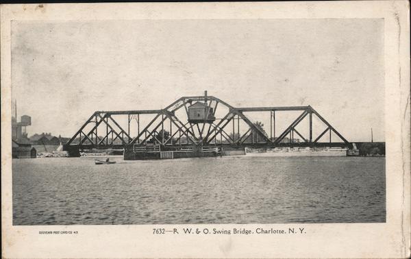 Front: SOUVENIR POST CARD CO N.Y. 7632-R W. & O. Swing Bridge, Charlotte, N. Y. Back: 2.21 Post Card- TWO CENTS