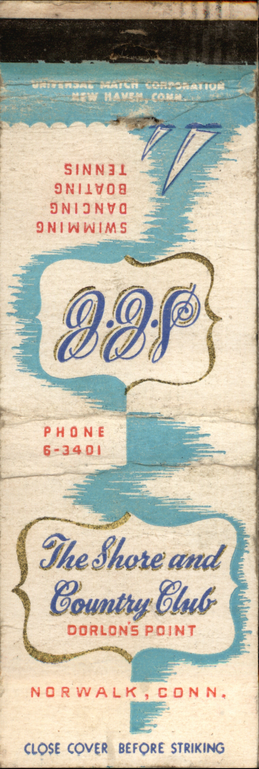 VRITENDAL MATCH CORPORATION NEW HAVEN, COMM. SINNE NIVOR UNIONCO 9NIWWIMS 2.JP PHONE 6-3401 The Shore and Country Club DORLON'S POINT NORWALK, CONN. CLOSE COVER BEFORE STRIKING