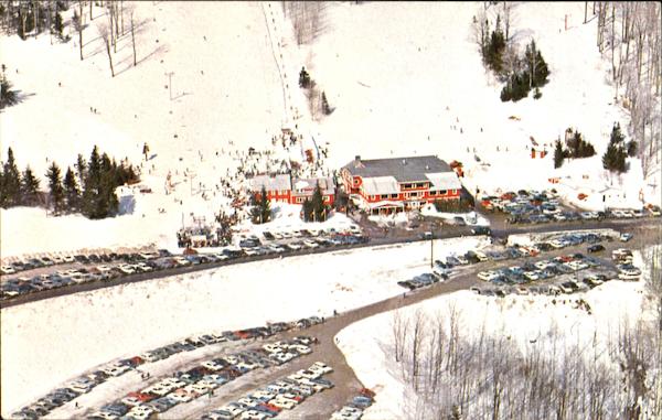 Aerial view of The Base at Bromley Mt., Bromley, Vermont where 5 of Bromley's 7 lifts begin and all skiing ends. This famous Mt. is also open for sightseers in summer and fall.