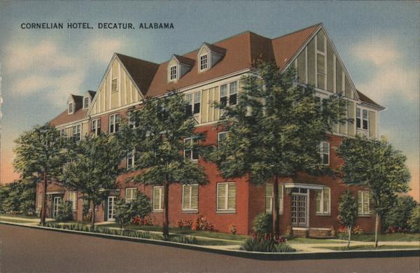 Front: CORNELIAN HOTEL, DECATUR, ALABAMA JUAL MAN 33333333 EEE 1 Back: CORNELIAN HOTEL, Decatur, Ala. In the Heart of the Tennessee Valley Good Fishing Visit the Dams 11672 A COLOURPICTURE PUBLICATION, CAMBRIDGE, MASS., U. S. A. HERE