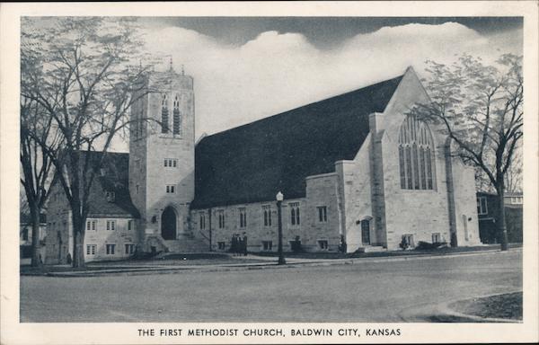 Front: II II-II JANUE=>) 11. 11 THE FIRST METHODIST CHURCH, BALDWIN CITY, KANSAS 10 Back: 2A2 PHOTO-TONE 1500 EAGLE Eagle Post Card View Co., Inc., N Y. VIEW CO INC.) 12100H13M 2100 1,00 MADE IN U. S. A.