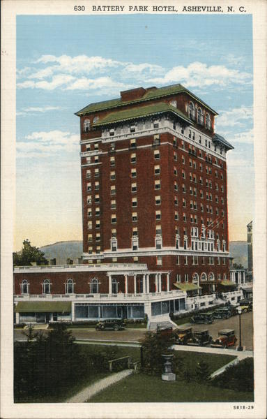 Front: ** pun mom 630 BATTERY PARK HOTEL, ASHEVILLE, N. C. **** ***** mitm 268 111W 1 1 10 1 12 0 1 11 1 11 9 3 1 11 0 90 91 1111111 111112 AA ** 5818-29 Back: ASHEVILLE POST CARD CO., ASHEVILLE, N. C. C. T. AMERICAN ART REG. U. S. PAT. OFF. we HERE