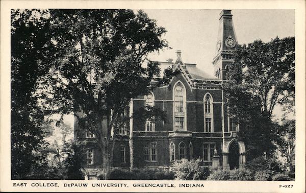 Front: LA 10 EAST COLLEGE, DEPAUW UNIVERSITY, GREENCASTLE, INDIANA F-627 Back: MFD. BY WAYNE PAPER BOX & PRTG. CORP., FORT WAYNE, IND. EB VIEW CLEAR PLACE