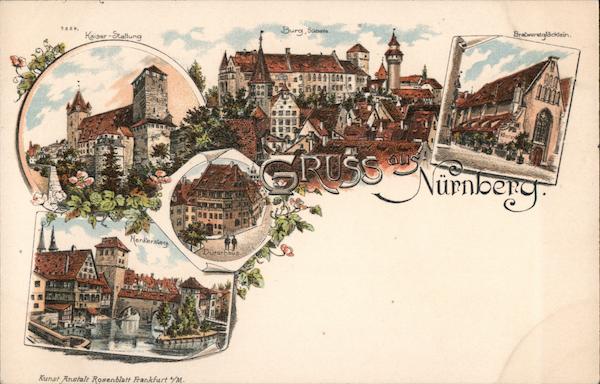 Front: 2.024. Kaiser-Stallung Henkersteg Kunst Anstalt Rosenblatt Frankfurt/M. Durerbaus. Burg, Südseite HAB On GIM ME ان 13584 Bratwurstglöcklein. Bentay PUSS Nürnberg. Back: Un in Postkarte